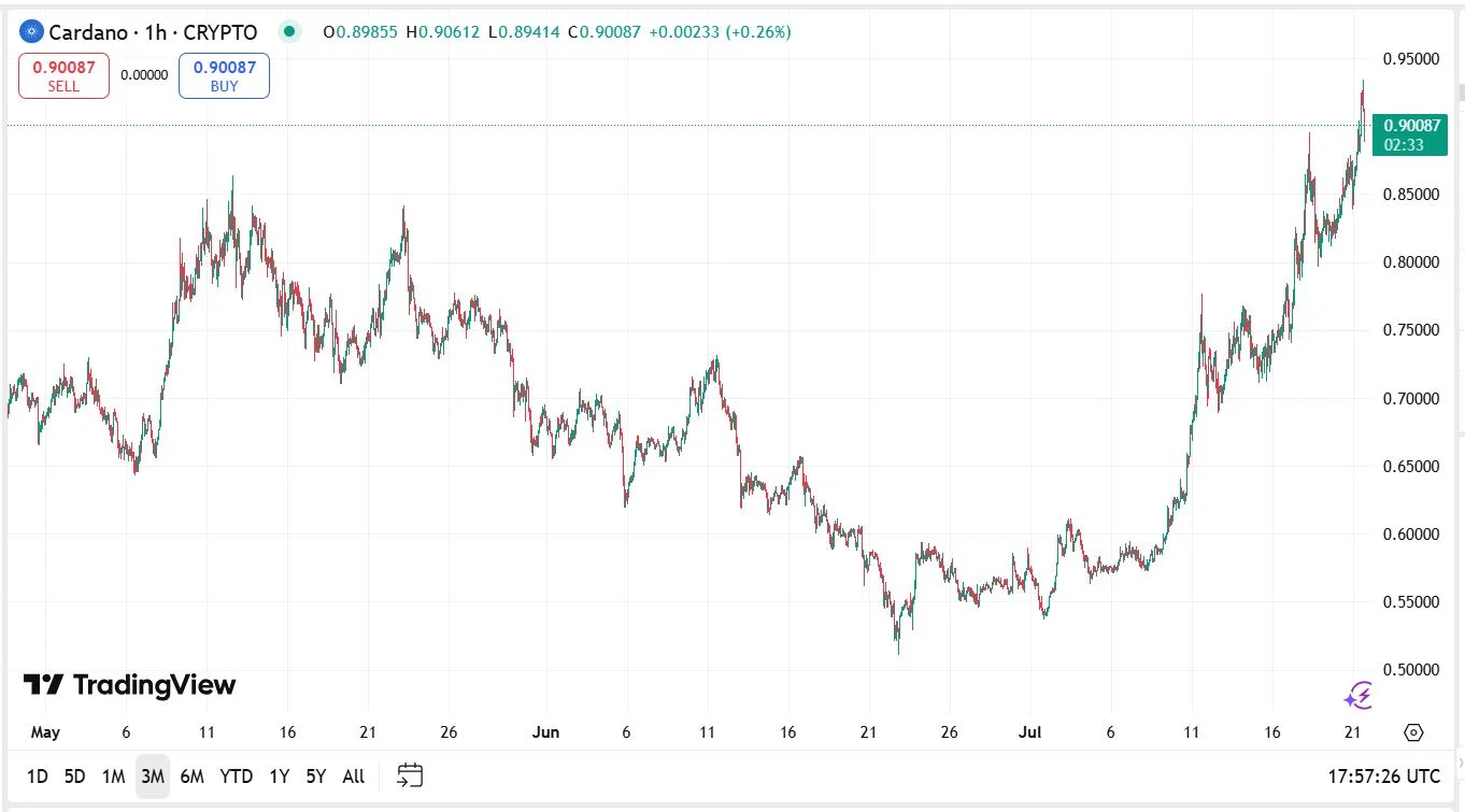 A 3 hónapos órás bontású grafikonon jól látható, hogy az ADA május eleje és július eleje között csökkenő trendben mozgott, egészen 0,50 USD közelébe. Július elején azonban trendforduló történt, és az árfolyam robbanásszerű emelkedésbe kezdett, amely során 80%-ot meghaladó pluszt ért el, jelenleg 0,90 USD körül járva. A legfrissebb árfolyammozgásban szinte függőleges emelkedés figyelhető meg, ami rövid távon túlvettségre utalhat.