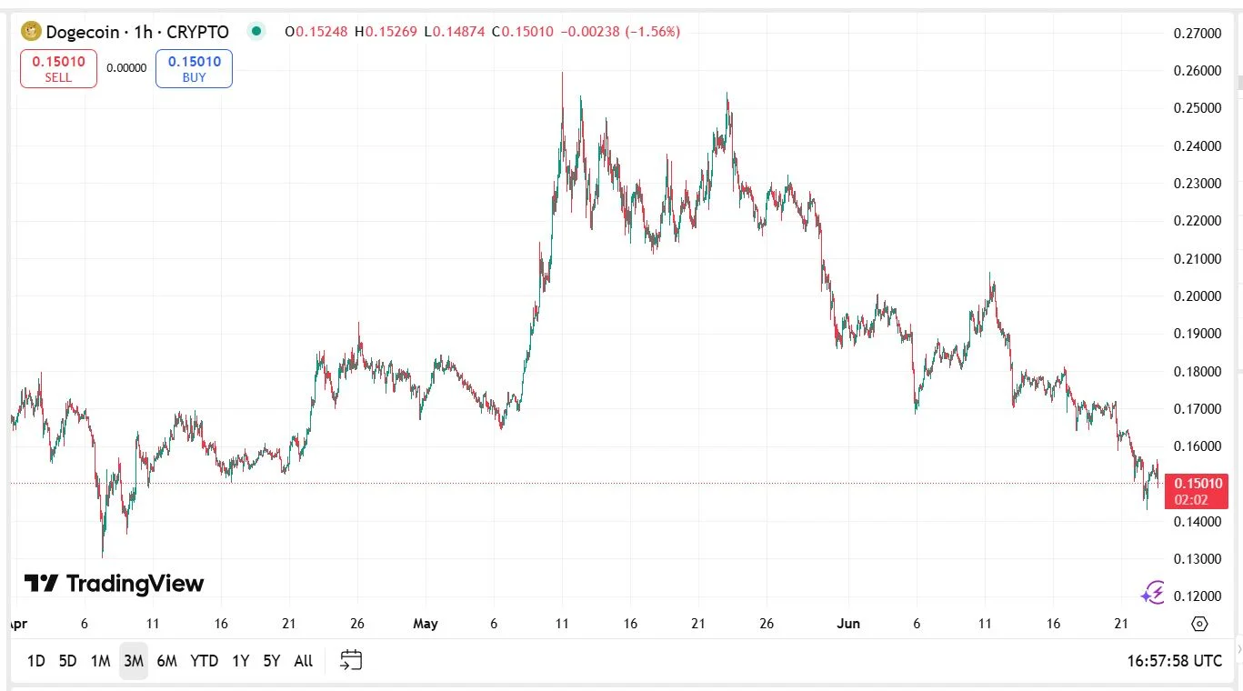 A csatolt három hónapos, órás bontású grafikon alapján jól látható, hogy a Dogecoin április vége óta egy jelentős emelkedésen ment keresztül, majd május közepétől egy lefelé tartó trend kezdődött. A csúcspont 0,27 USD körül alakult ki, míg az árfolyam jelenleg 0,15 USD környékén mozog. Ez azt jelenti, hogy a piac erőteljes korrekción ment keresztül, és jelenleg kulcsfontosságú támaszszinteket tesztel.