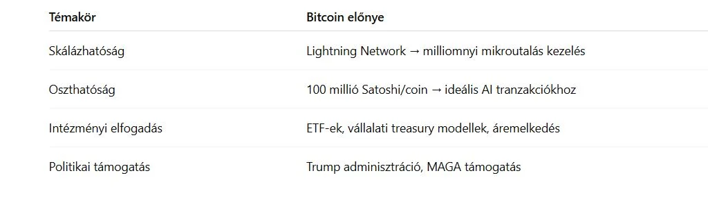 A technológiai struktúra (Lightning), a pénzügyi háttér (ETFebek, MicroStrategy, ARK, Galaxy) és a politikai légkör együttesen vázolják fel azt a keretet, ahol a Bitcoin nem csupán egy kriptovaluta, hanem az AI-gazdaság jövőbeli fizetőeszköze lehet.