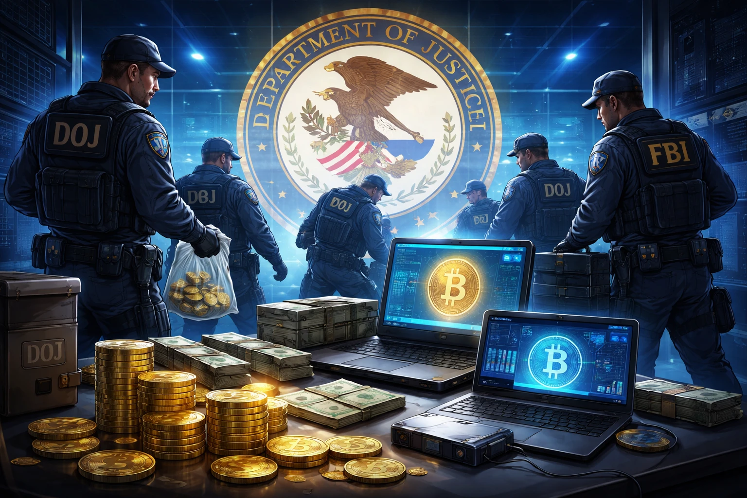 A DOJ jelentése szerint nemcsak vádat emelnek, hanem vagyonelkobzásokat is végrehajtanak — beleértve kriptovalutát, készpénzt, ingatlant és luxuscikkeket — mutatva a kripto integrációját a hagyományos vagyonokkal szemben.