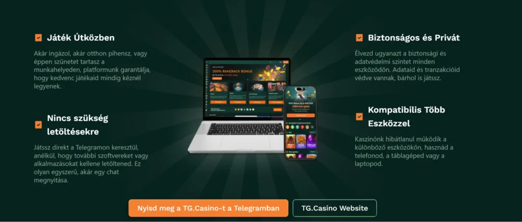 A TG.Casino rövid fennállása ellenére komoly felhasználói bázist tudott kiépíteni, és ma már az egyik legnépszerűbb kripto kaszinó és fogadóiroda. Ez a szerencsejáték oldal többek között arról vált ismertté, hogy lehetővé teszi a játékosainak a Telegram alkalmazáson keresztüli játékot. Ez azt jelenti, hogy a kaszinó játékaival egy Telegram chat ablakon belül is szerencsét próbálhatunk, így még a böngészőnket sem kell megnyitnunk, ha egy kis kikapcsolódásra vágyunk.