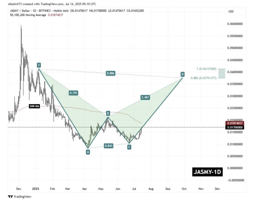 A JASMY árfolyama az elmúlt 24 órában 12%-ot ugrott, heti szinten pedig már 38%-os növekedést mutat. Bár ez önmagában is figyelemre méltó, a technikai elemzők figyelmét most egy alakuló Bearish Bat harmonikus minta köti le, amely a napi grafikonon formálódik.