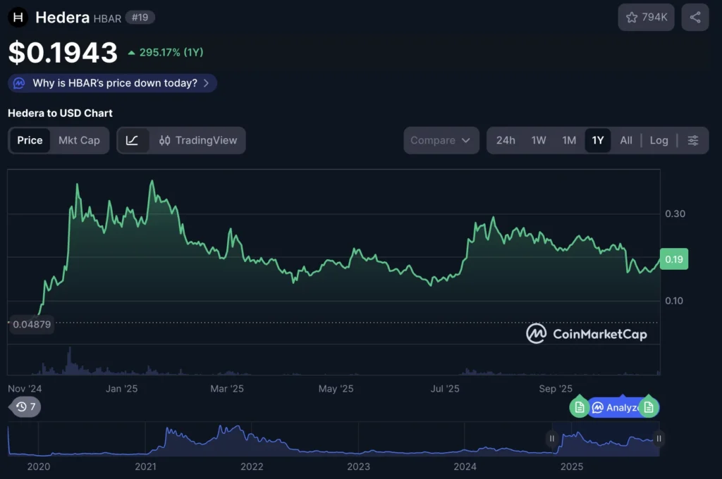 HBAR: 0,19 USD/token, 8,2 milliárd dolláros piaci kapitalizáció