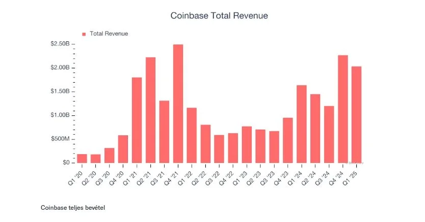 A Coinbase legutóbb 2,03 milliárd dolláros bevételt jelentett, ami ugyan 24,2%-os éves növekedés, de még így is 3,6%-kal elmaradt az elemzői konszenzustól. A vállalat 9,7 millió havi aktív felhasználót regisztrált, ami 21,3%-os növekedést jelent az előző évhez képest, miközben az EBITDA összhangban volt az elvárásokkal.